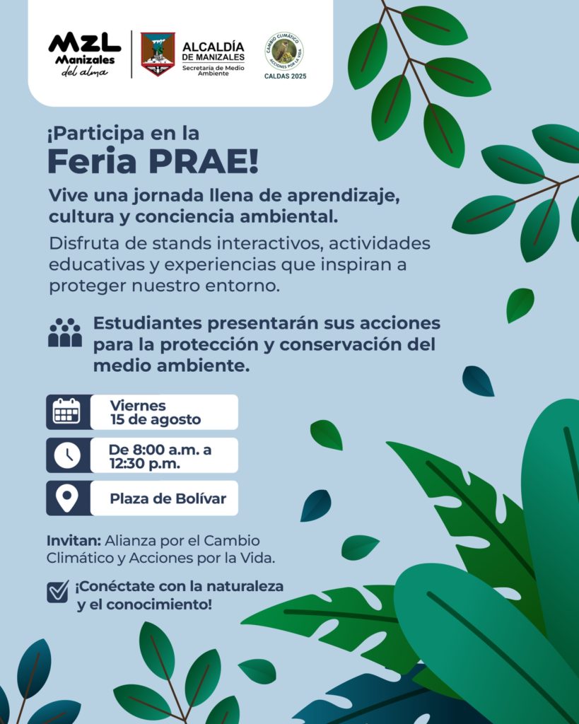 Este viernes 15 de agosto, la Plaza de Bolívar de Manizales será el escenario de la Feria PRAE (Proyectos Ambientales Escolares), evento que reunirá a estudiantes, docentes, instituciones y comunidad en general para celebrar una jornada de intercambio de saberes y experiencias en torno a la protección y conservación del medio ambiente. Imagen: invitación a […]
