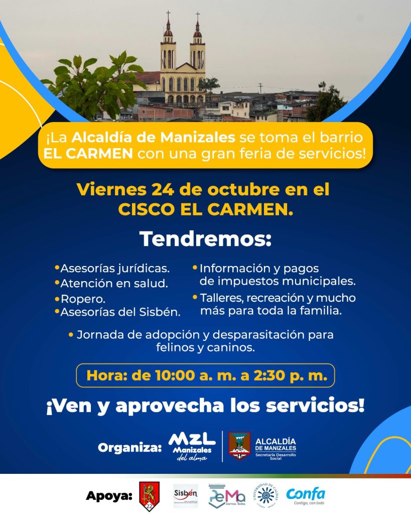 La Alcaldía de Manizales, a través de la Oficina de Promoción Comunitaria de la Secretaría de Desarrollo Social, acerca su oferta institucional a las comunidades y, esta vez el turno es para el barrio El Carmen, donde el viernes 24 de octubre se vivirá una gran feria de servicios en el CISCO, de 10 de […]
