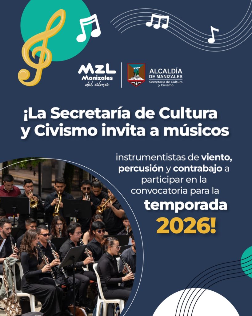 La Secretaría de Cultura y Civismo de la Alcaldía de Manizales invita a músicos instrumentistas de viento, percusión y contrabajo a participar en la convocatoria para integrar la Banda Municipal de Música de Manizales en su temporada 2026. Esta agrupación, fundada el 13 de octubre de 1991 e institucionalizada por el Acuerdo 160 de 1995 […]