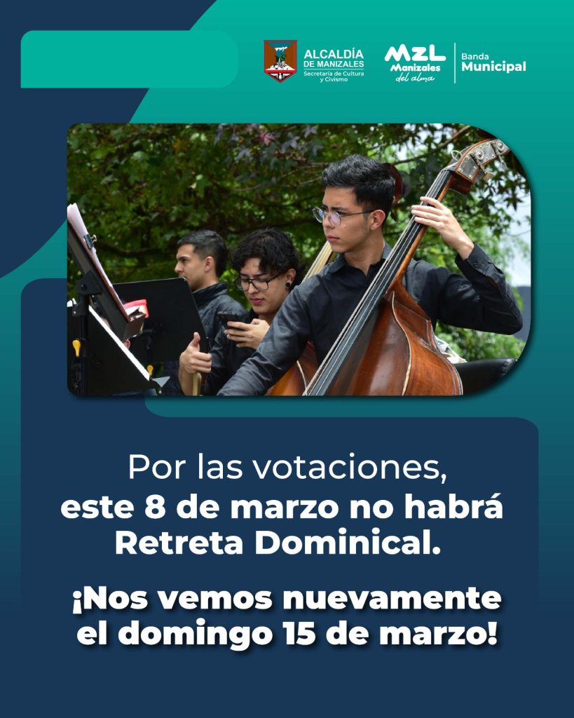 La Secretaría de Cultura y Civismo de Manizales informa a la ciudadanía que este domingo 8 de marzo no se realizará la Retreta Dominical, debido a la jornada de elecciones programada para esa fecha. La actividad cultural se reanudará el próximo domingo 15 de marzo a las 11:30 a. m., en el Parque Ernesto Gutiérrez, […]
