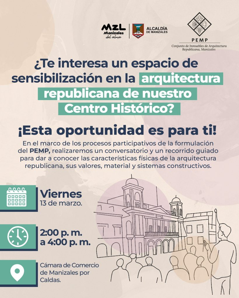 Manizales genera espacios para acercar a la ciudadanía al valor histórico de su Centro. Este viernes 13 de marzo se realizará una nueva edición de los Viernes de PEMP, una jornada dedicada a profundizar en el conocimiento del patrimonio arquitectónico local. El encuentro estará enfocado en la arquitectura republicana, uno de los elementos más representativos del paisaje urbano […]