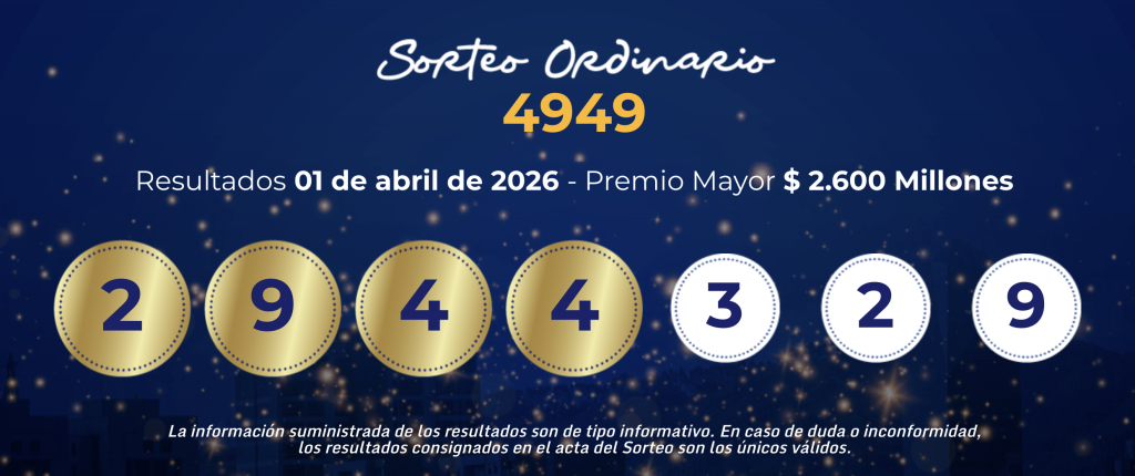El sorteo número 4949 de la Lotería de Manizales se llevó a cabo el miércoles primero de abril dejando los siguientes resultados: