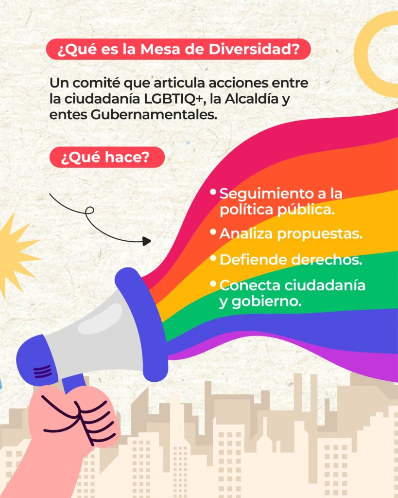 La Mesa se define como un órgano consultivo que respalda la gestión pública, su propósito central consiste en crear escenarios de discusión y articular acciones entre distintas entidades, en los cuales participan dependencias de la Alcaldía, organizaciones sociales y líderes independientes del sector LGBTIQ+.
