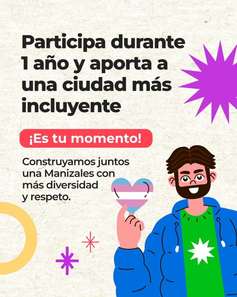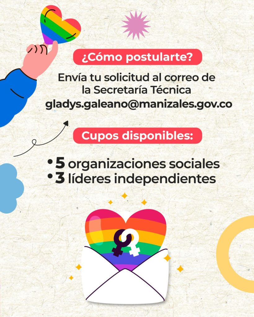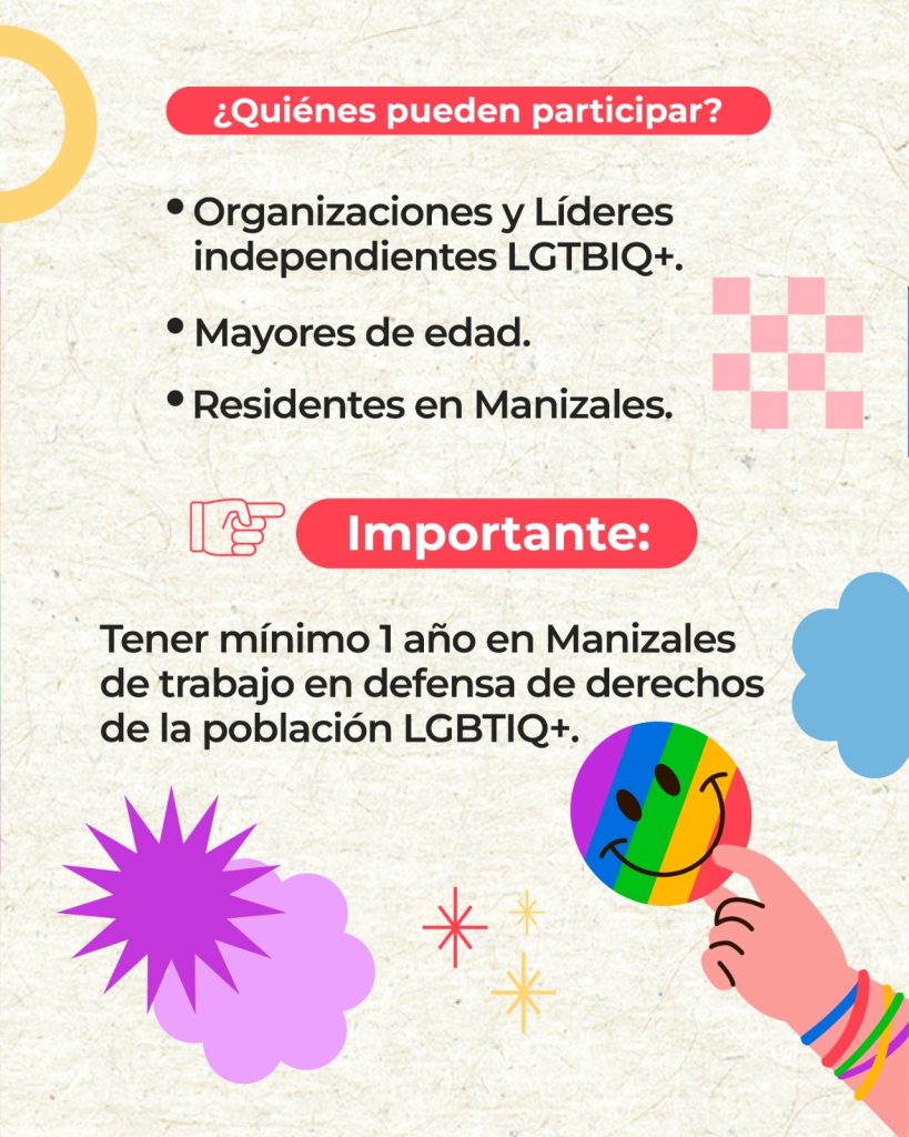 La convocatoria está dirigida a personas mayores de edad que se identifiquen como parte de la población LGBTIQ+ y que residan en Manizales de forma continua. Quienes aspiren deben acreditar al menos un año de trabajo en temas relacionados con la defensa de derechos de esta comunidad.
