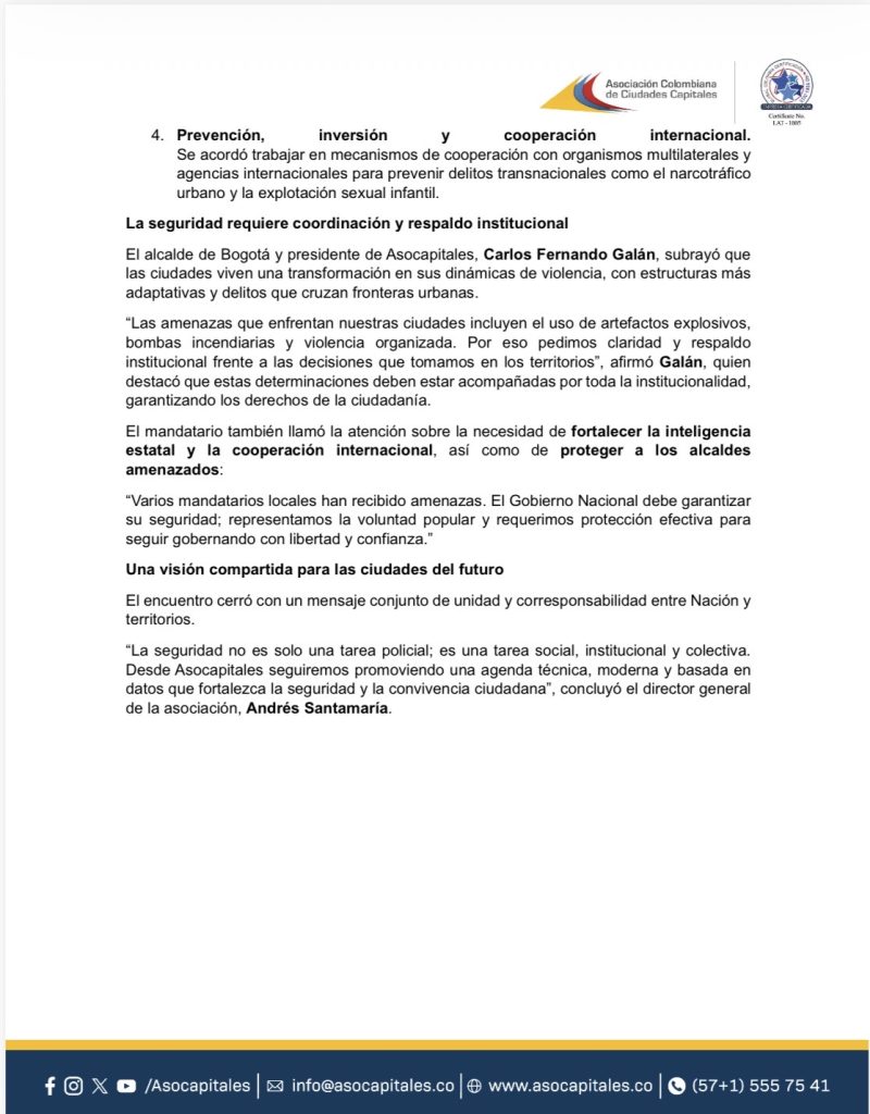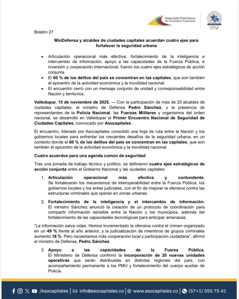 - MinDefensa y alcaldes de ciudades capitales acuerdan cuatro ejes para fortalecer la seguridad urbana.