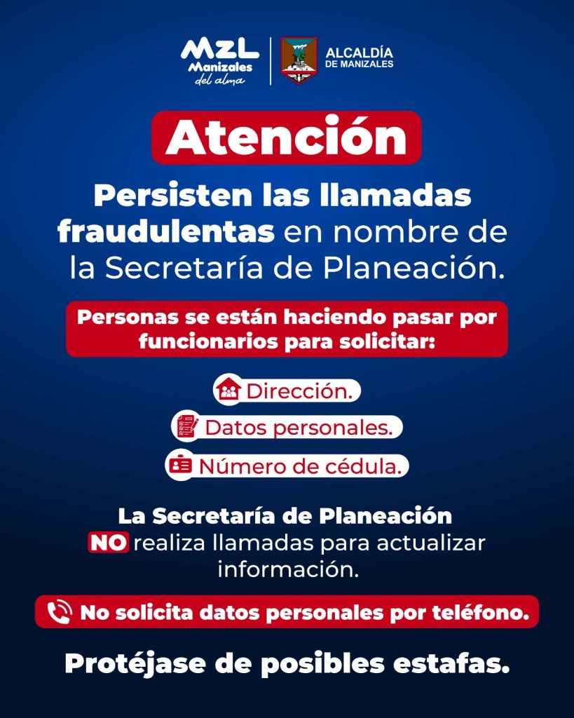 - La Alcaldía de Manizales informó que continúan los intentos de suplantación en nombre de la Secretaría de Planeación, a través de llamadas telefónicas en las que se solicita información personal a los ciudadanos.