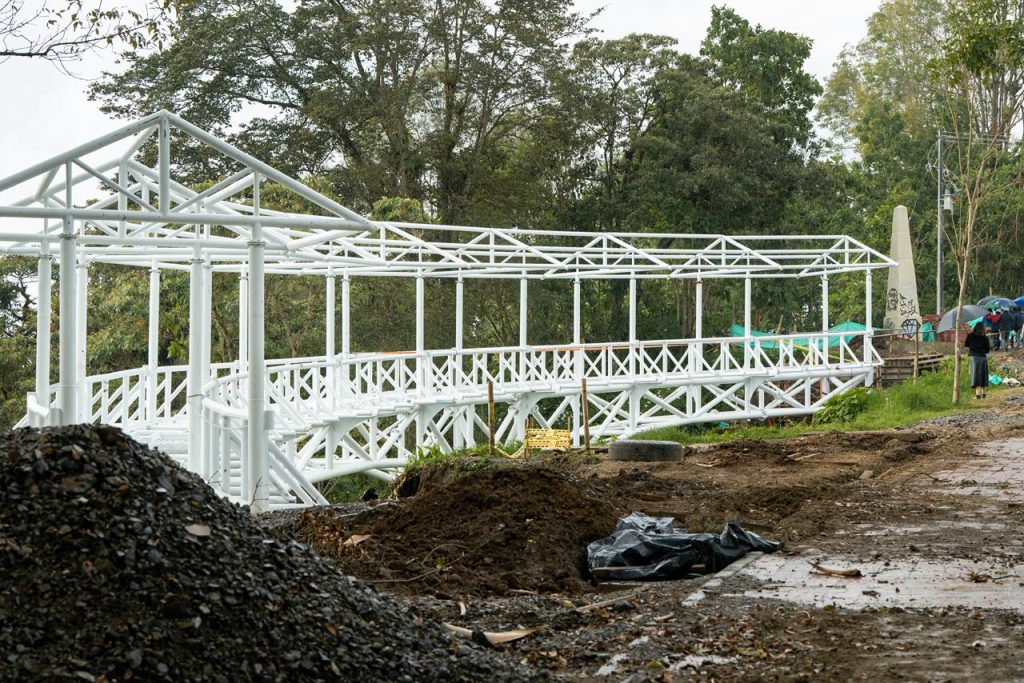En el Frente 3, donde se construye el esperado Puente de Vidrio, se registran progresos significativos. Este tramo comprende las obras entre el puente y el jardín infantil Santa Bernardita, incluyendo pérgolas, la cobertura de la media torta, baterías sanitarias, bahías de parqueo y paraderos. En los últimos días se adelantó la excavación para conformación de subrasante, además de la instalación de afirmado y tubería eléctrica, junto con la construcción de cajas eléctricas. Así mismo, se realizó el revoque de la pared posterior de los baños ubicados en la pérgola 1 y continuó la instalación de la estructura metálica del puente, acompañada del retiro de la formaleta en la pantalla del estribo de salida de esta estructura icónica.