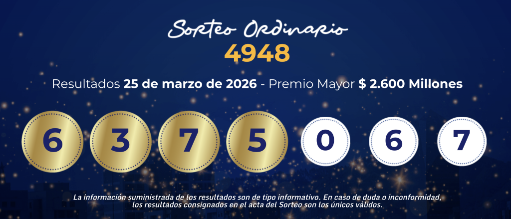 El sorteo número 4948 de la Lotería de Manizales se llevó a cabo el miércoles 25 de marzo dejando los siguientes resultados: