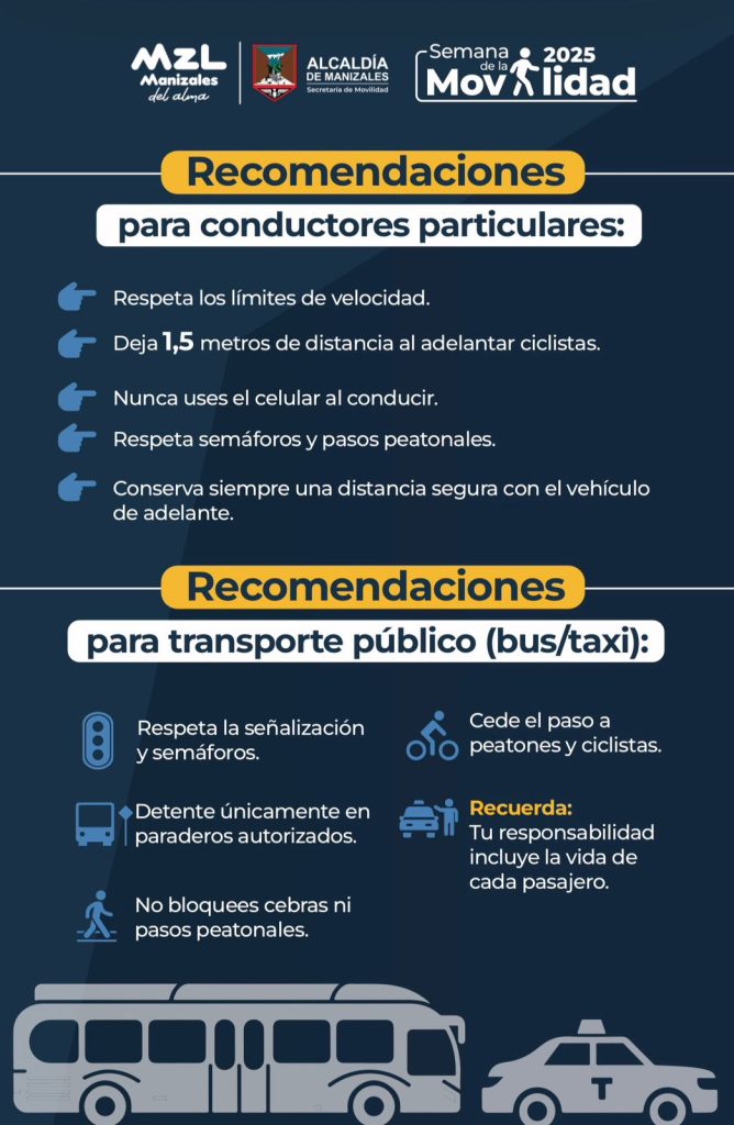 Imágenes: recomendaciones para conductores particulares y de transporte público, orientadas a reducir siniestros y promover la seguridad vial en Manizales.