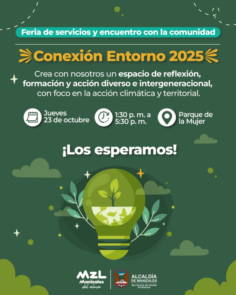 La Alcaldía de Manizales, a través de la Secretaría de Medio Ambiente, invita a la ciudadanía a participar en Conexión Entorno 2025, una feria de servicios y encuentro con la comunidad que busca generar un espacio de reflexión, formación y acción en torno a la sostenibilidad ambiental, con especial énfasis en la acción climática y la gestión del territorio.