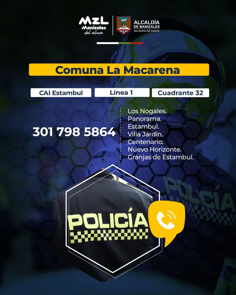 La Alcaldía de Manizales progresa en su compromiso por la seguridad y la convivencia de los ciudadanos, es por esto que, la Secretaría del Interior y la Policía Metropolitana de Manizales trabajan en conjunto de manera permanente para cumplir con cada requerimiento de la comunidad y, para velar por la tranquilidad ciudadana. Así, la Secretaría del Interior socializa los números de contacto directo del Centro de Atención Inmediata (CAI).
