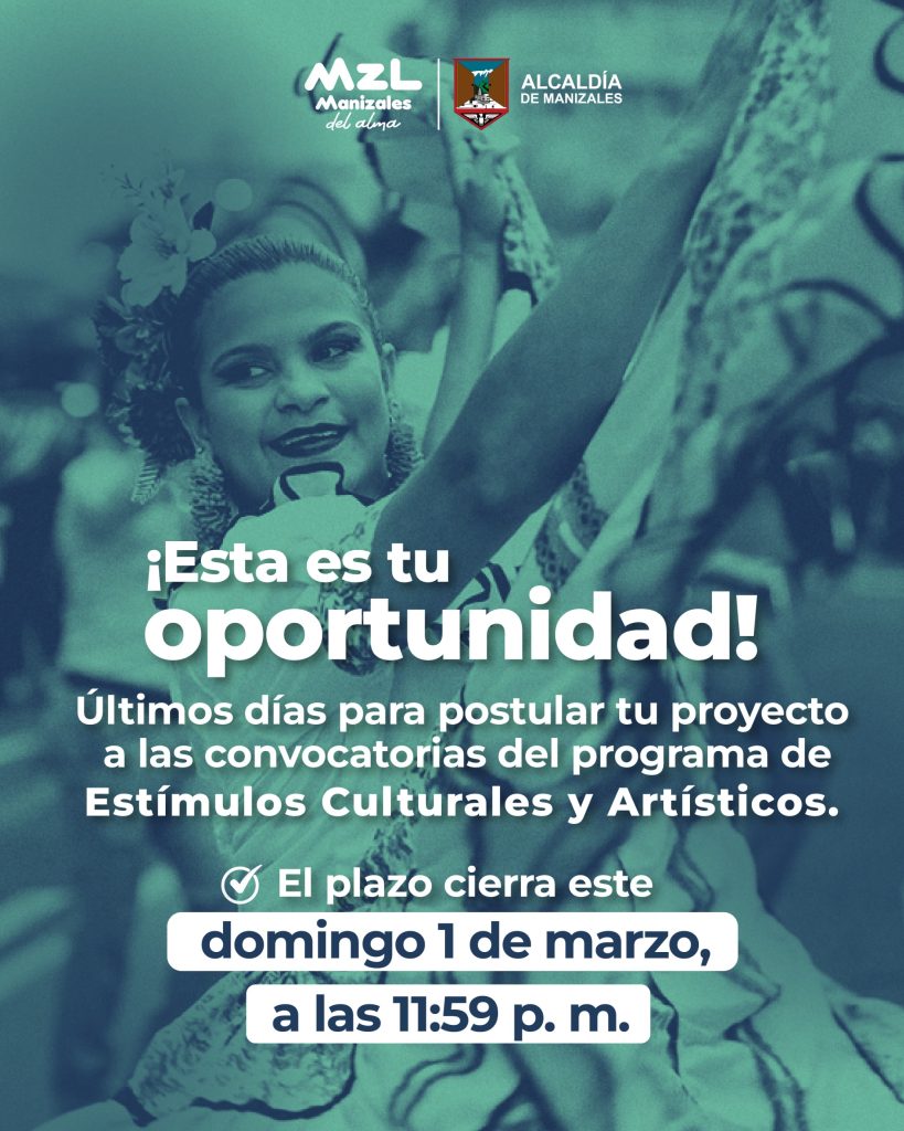 La Alcaldía de Manizales hace un llamado a artistas, gestores y colectivos culturales de la ciudad para que presenten sus propuestas a las convocatorias del Programa de Estímulos Culturales y Artísticos 2026. El plazo de inscripción vence el próximo domingo 1 de marzo a las 11:59 p. m.