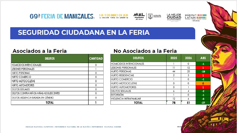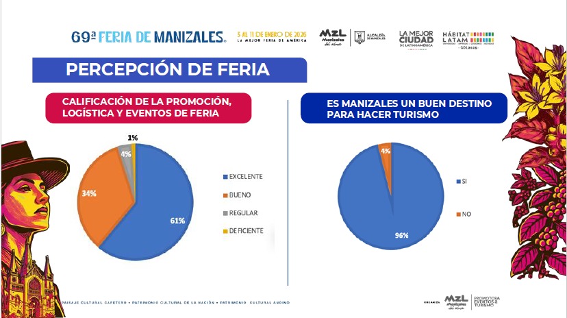 La Alcaldía de Manizales entregó un exitoso balance de la realización de la Feria de Manizales número 69. En la rueda prensa convocada para presentar los resultados, se destacaron los logros en: seguridad, número de eventos y visitantes, organización, impacto económico y de generación de empleo. El alcalde, Jorge Eduardo Rojas Giraldo, resaltó que la Feria fue un rotundo éxito, con mejores indicadores que la del año pasado.