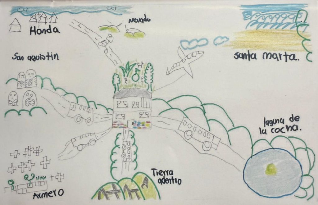 Arte y Cartografía: tuvo como objetivo explorar y documentar donde identificaron lugares importantes y significativos de su entorno a partir de la creación de mapas creativos, reconociendo la importancia de su territorio. La cartografía social es una herramienta que integra elementos geográficos y, símbolos sagrados y afectivos.