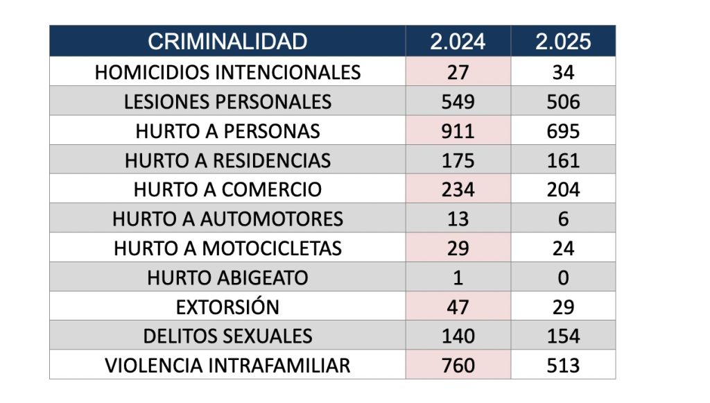 En materia de seguridad ciudadana, se pudo evidenciar una alta reducción en delitos como hurto a personas en un 24%, hurto a motocicletas con 62%, hurto a celulares con 25% y violencia intrafamiliar con 21%.