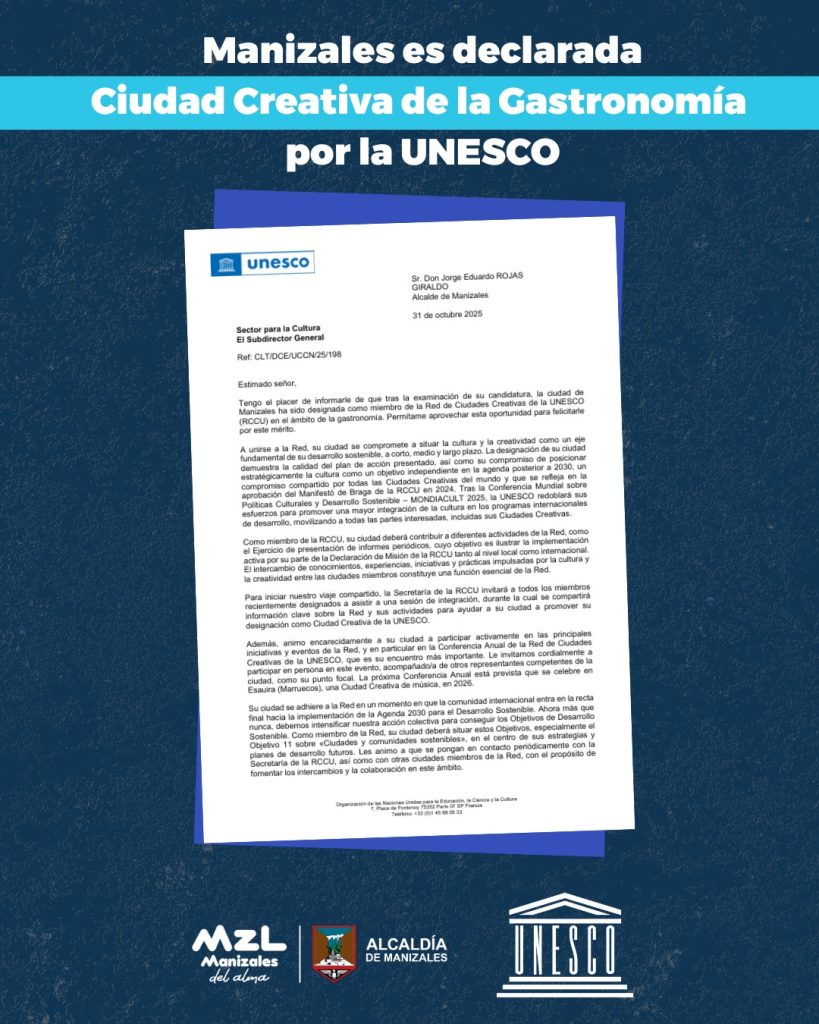 - La UNESCO ha creado una red de Ciudades Creativas, que abarca siete áreas, y hoy, Manizales se une a el selecto grupo bajo la categoría de Gastronomía. Somos la tercera ciudad en Colombia en recibir el reconocimiento, con Popayán (2005) y Buenaventura (2017).