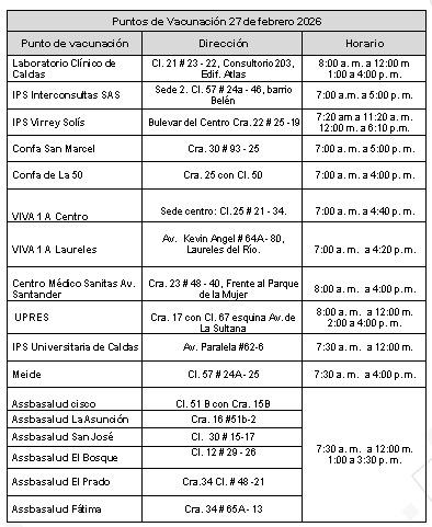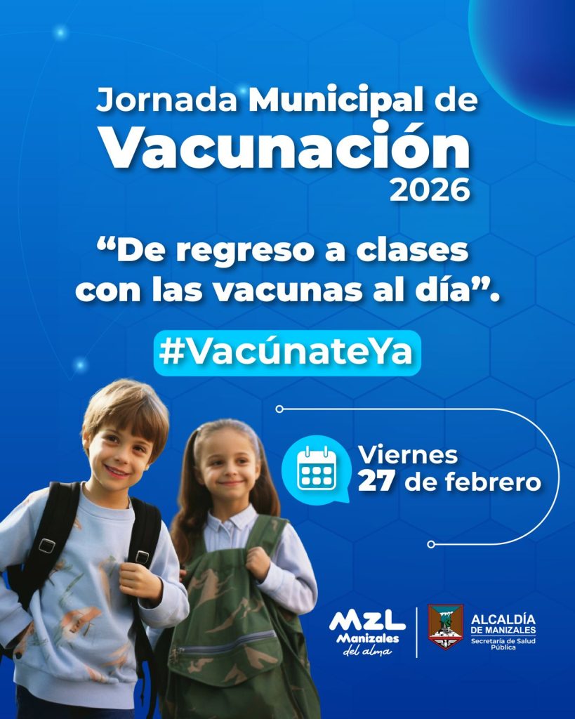 La Secretaría de Salud Pública de Manizales, a través del Programa Ampliado de Inmunizaciones (PAI), lidera la Primera Jornada Municipal de Vacunación 2026 bajo el lema “De regreso a clases con las vacunas al día #VacúnateYa”. La estrategia busca identificar y disminuir la población susceptible acumulada en enero y fortalecer las coberturas municipales durante todo el mes de febrero, con énfasis especial el 27 de febrero.