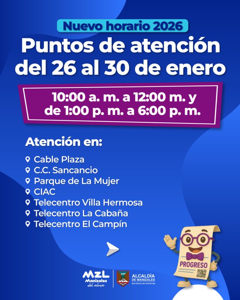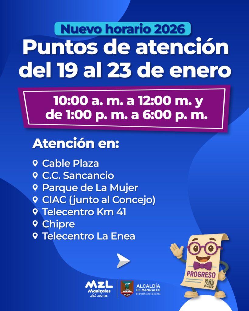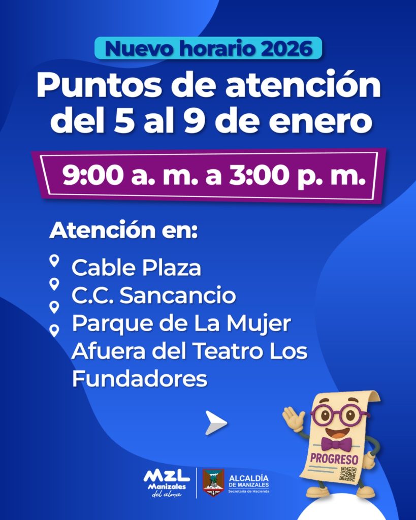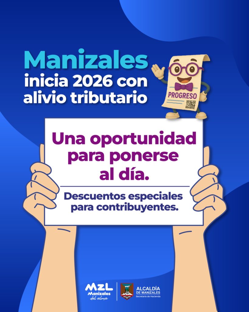 La Alcaldía de Manizales hizo un llamado a la ciudadanía para consultar oportunamente el calendario tributario, cumplir con sus obligaciones dentro de los plazos establecidos y aprovechar los beneficios por pronto pago, los cuales contribuyen al fortalecimiento de las finanzas públicas del Municipio.