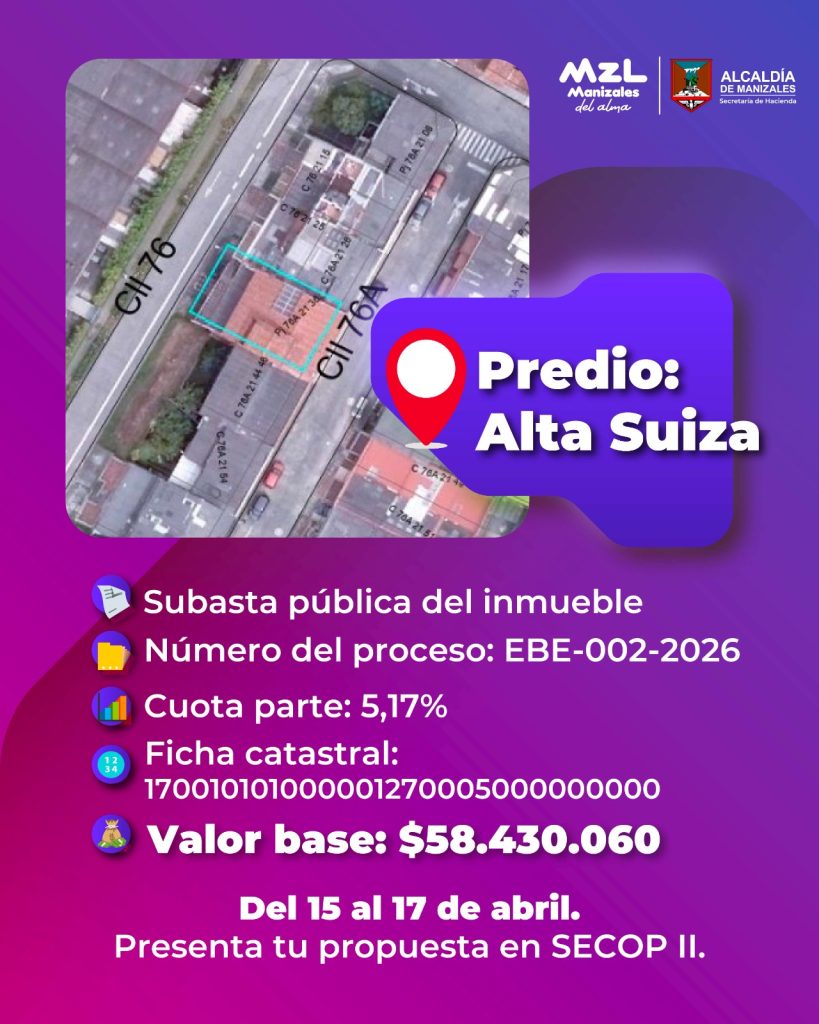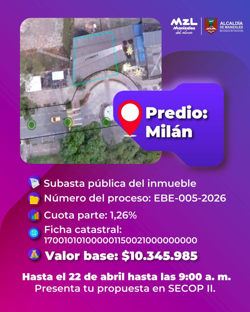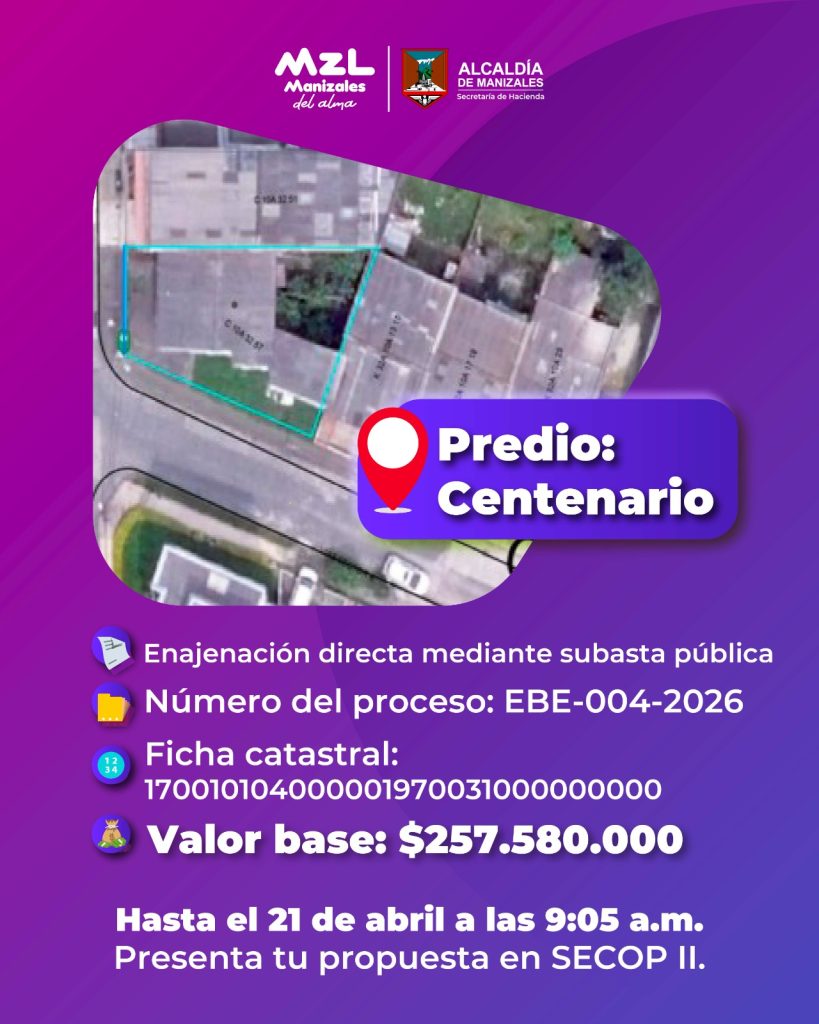 La Secretaría de Hacienda de Manizales invita a la ciudadanía a participar en la convocatoria abierta para invertir en cuatro predios del municipio, una oportunidad que busca optimizar activos públicos y promover el desarrollo de la ciudad mediante subasta.