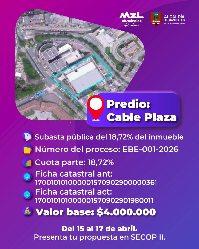 Además del lote en Centenario, la convocatoria incluye tres porcentajes de bienes inmuebles: un porcentaje de un parqueadero en Cable Plaza, un porcentaje de un predio comercial en el sector de Milán y un porcentaje de un predio habitacional en Alta Suiza.