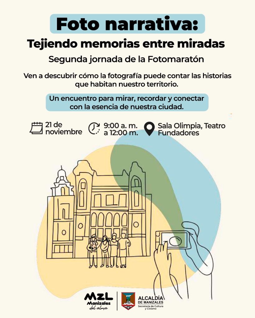 La Unidad de Patrimonio de la Alcaldía de Manizales invita a los medios de comunicación a la segunda jornada de la Fotomaratón, titulada ‘Foto narrativa: Tejiendo memorias entre miradas’, espacio que busca transformar las miradas individuales en narrativas visuales colectivas sobre el patrimonio urbano de la ciudad.