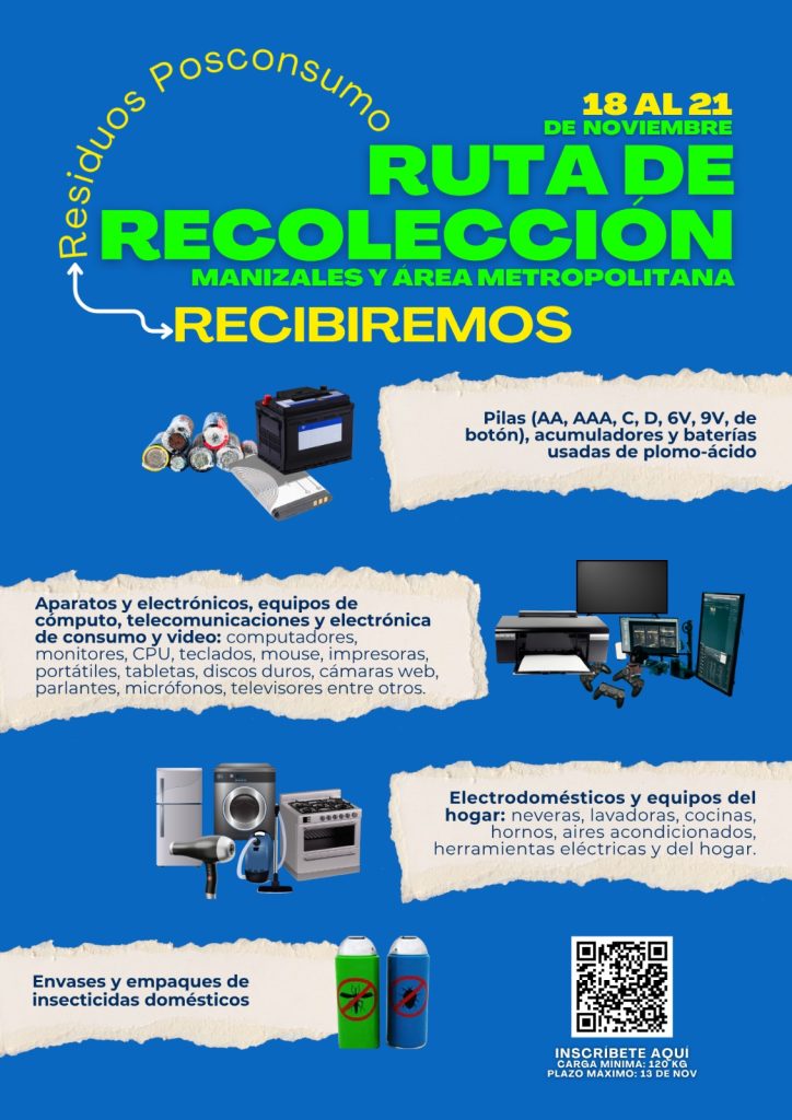 Del 18 al 21 de noviembre, Manizales y su área metropolitana se unen en la ruta de recolección de residuos posconsumo, iniciativa que busca promover el manejo adecuado de productos que, tras cumplir su vida útil, requieren una disposición especial por sus componentes potencialmente contaminantes.