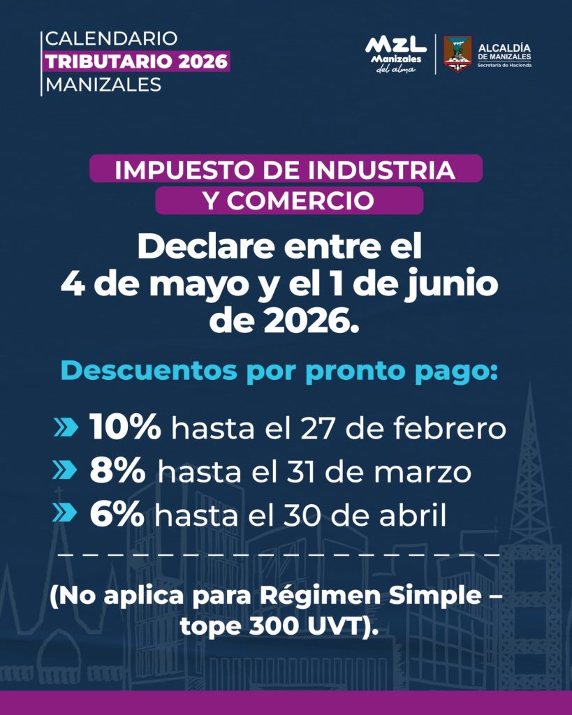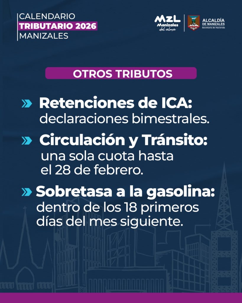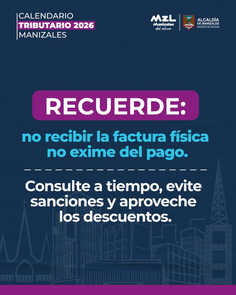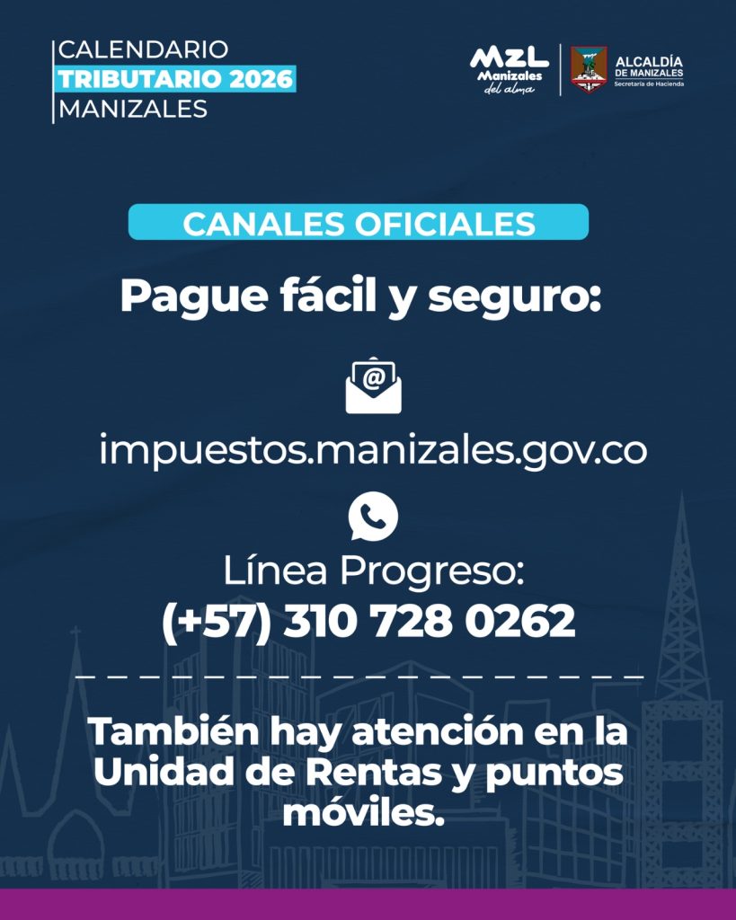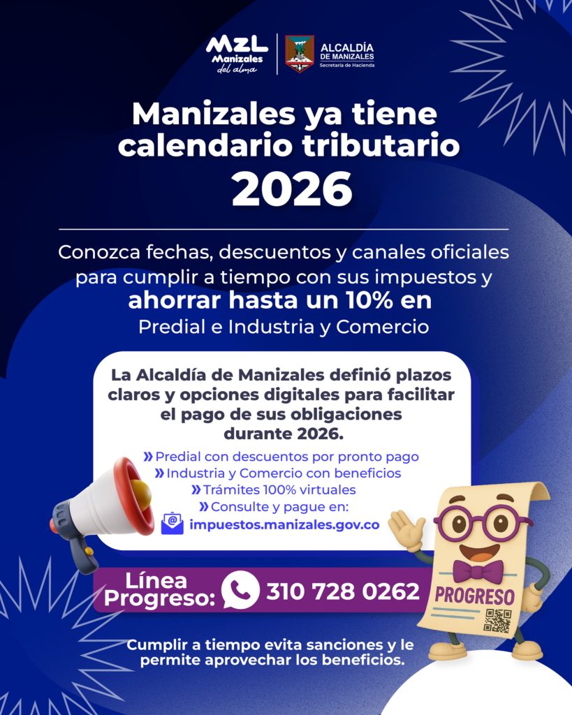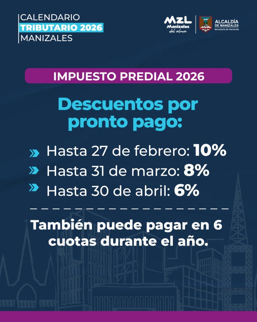 • La Alcaldía de Manizales definió el calendario tributario para 2026 con fechas claras, descuentos por pronto pago y múltiples canales digitales.