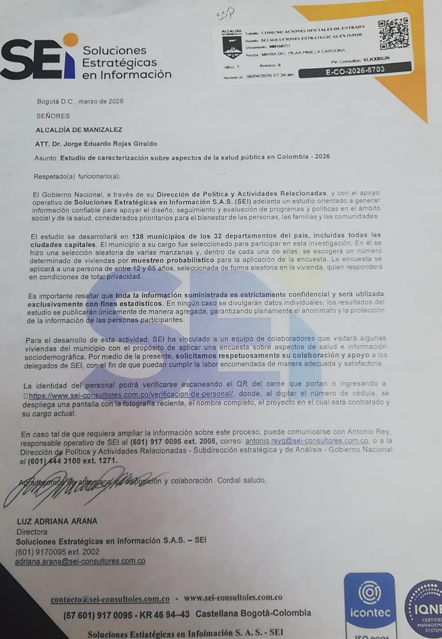 Secretaría de Salud Pública Secretaría de Salud de Manizales aclara que no hay comunicación oficial sobre encuesta nacional en circulación abril 7, 2026