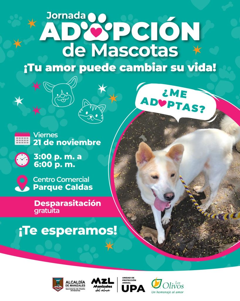 Este viernes 21 de noviembre, el centro comercial Parque Caldas será el punto de encuentro para quienes deseen adoptar una mascota. La Secretaría de Medio Ambiente y su Unidad de Protección Animal (UPA) invitan a la comunidad a participar en la Jornada, espacio creado para promover la adopción responsable y facilitar que más animales encuentren un entorno seguro y estable.