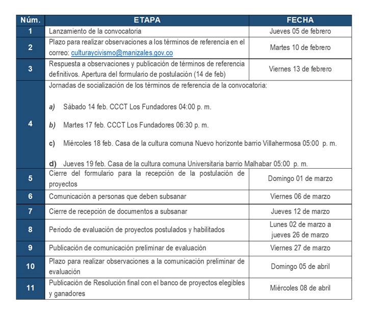 La Secretaría de Cultura y Civismo informa a la ciudadanía que, tras el cierre del periodo de observaciones realizado el pasado 10 de febrero, se dio cumplimiento al proceso de revisión y ajuste de los términos de referencia del Programa de Estímulos Culturales y Artísticos 2026 y sus tres convocatorias, que entregarán cerca de $2.800 millones al sector cultural de Manizales.