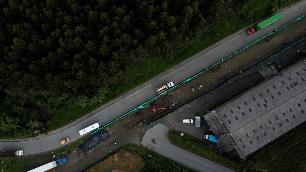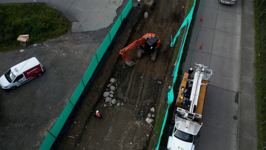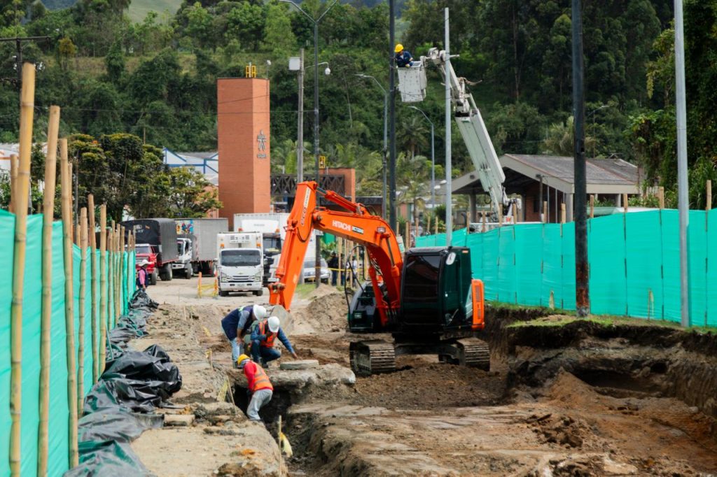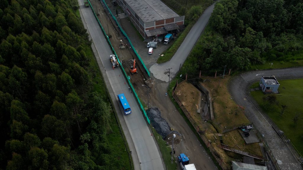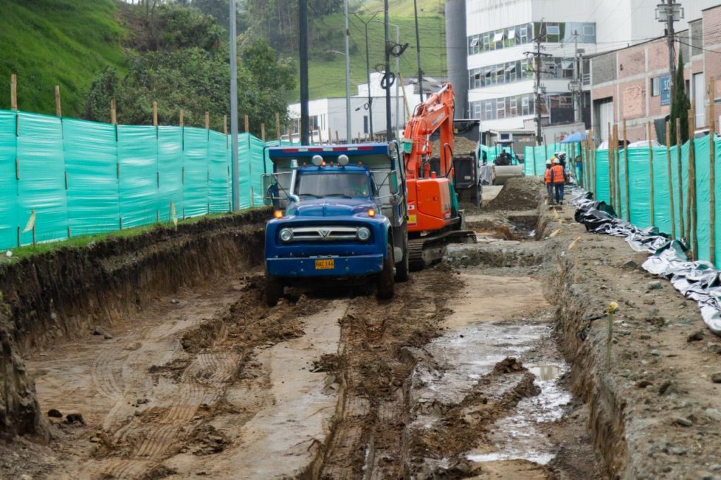 Actualmente, en el punto se desarrollan trabajos de adecuación del terreno y estructuras, con la presencia de un equipo operativo robusto que incluye un tren de 23 volquetas, maquinaria especializada y cuatro frentes de trabajo activos. Las labores se ejecutan de manera simultánea en procesos de filtros, cajeo, construcción de pozos de inspección y el cerramiento de obra, lo que permite una intervención organizada y sectorizada.