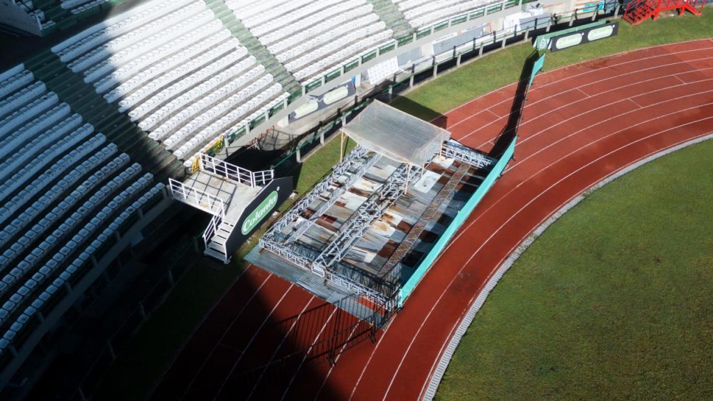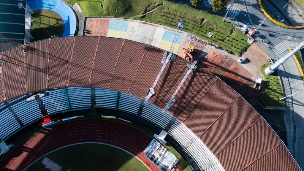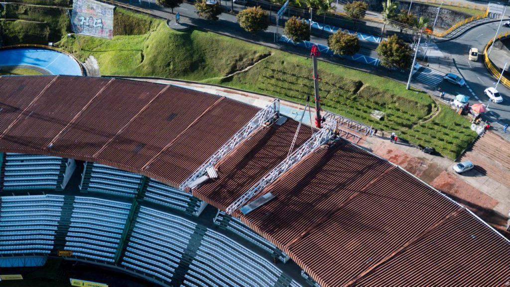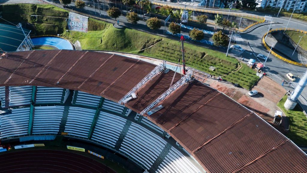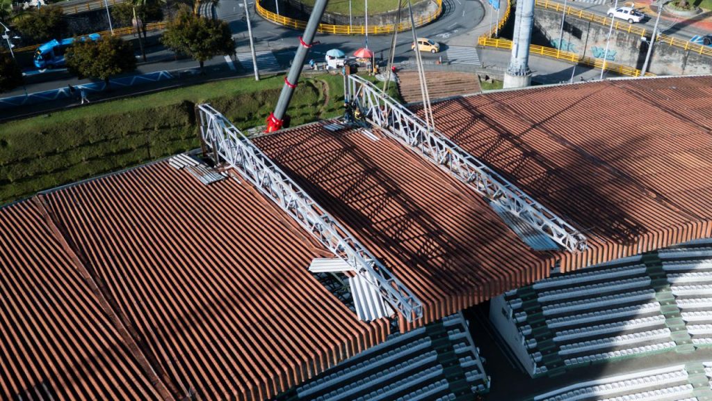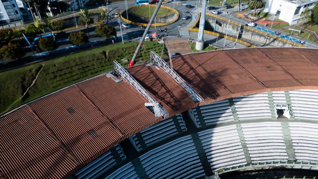 La Alcaldía de Manizales continúa el proceso de modernización del Estadio Palogrande, con la instalación de la estructura que soportará la nueva pantalla LED del escenario deportivo, que estará ubicada en la tribuna sur; ya fueron montadas las dos cerchas principales, un paso clave dentro del proceso técnico que permitirá dar continuidad al montaje de la infraestructura en el costado sur del estadio.