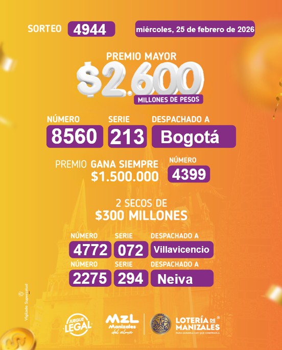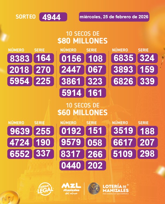 - Estos son los resultados del sorteo del miércoles 25 de febrero de 2026 de la Lotería de Manizales.