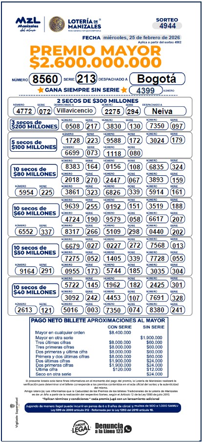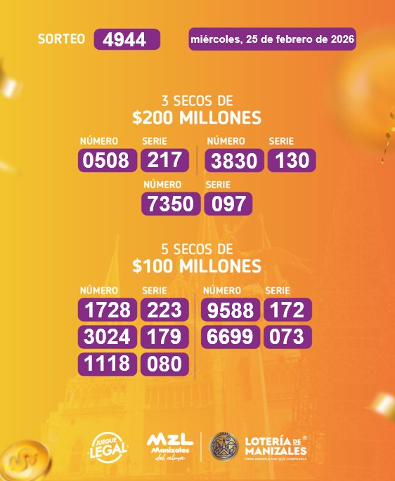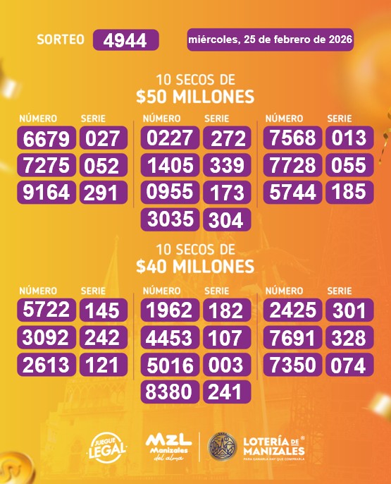El sorteo número 4944 de la Lotería de Manizales se llevó a cabo el miércoles 25 de febrero dejando los siguientes resultados: