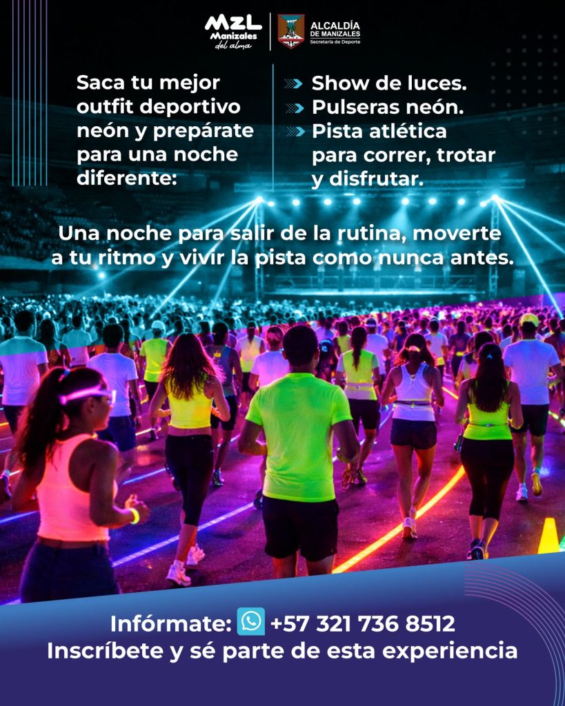 La Alcaldía de Manizales, a través de la Secretaría del Deporte, invita a la ciudadanía a participar en “Corre, Brilla y Muévete MZL”, evento que llenará de luz, actividad física y entretenimiento el Estadio Palogrande este 23 de abril, entre las 6:00 y las 9:00 p.m.