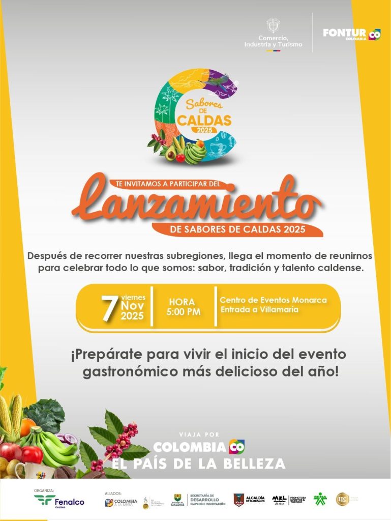 • La Alcaldía de Manizales y diferentes aliados invitan a disfrutar de Sabores de Caldas, un evento que reúne tradición, innovación y talento local en el Centro de Eventos Monarca, del 7 al 9 de noviembre, de 10:00 a. m. a 8:00 p. m.