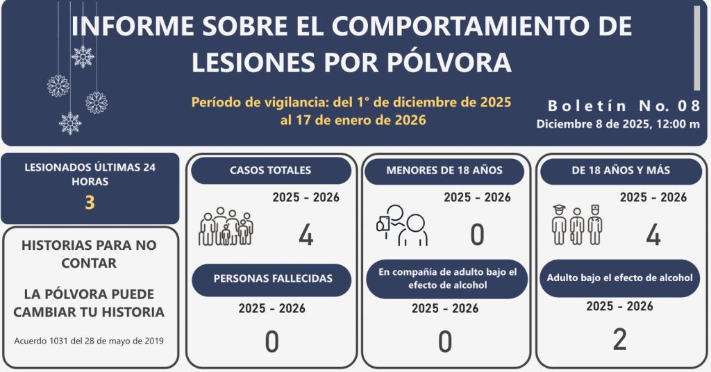 El periodo de vigilancia se extenderá hasta el 17 de enero de 2026, por lo que las autoridades reiteran el llamado a la prevención para evitar nuevos casos. Bajo el mensaje “Historias para no contar: la pólvora puede cambiar tu historia”, la campaña busca reducir la manipulación de estos elementos y desalentar su uso, especialmente en combinación con alcohol.