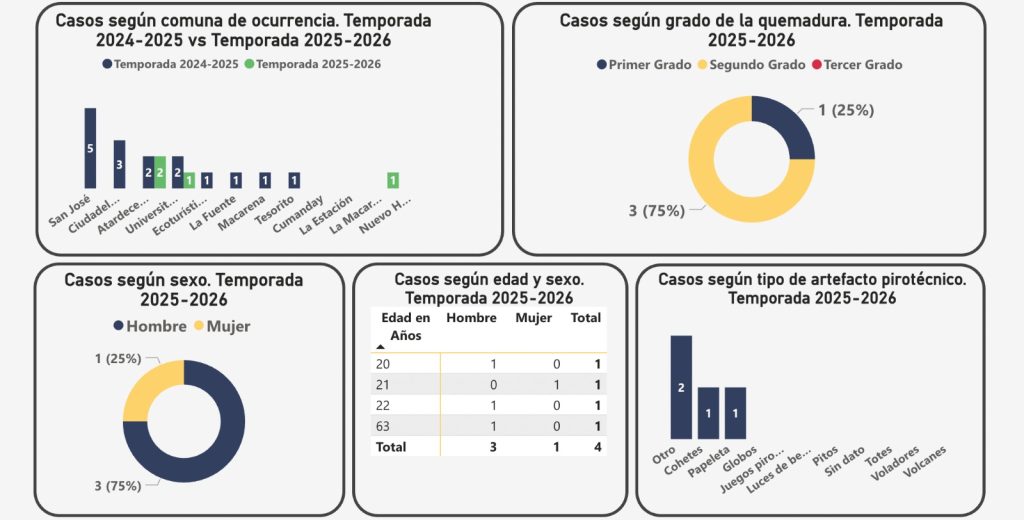 Del 1 al 8 de diciembre de 2025, Manizales ha registrado cuatro casos de lesiones por pólvora pirotécnica, según el más reciente boletín de vigilancia emitido este 8 de diciembre al mediodía.