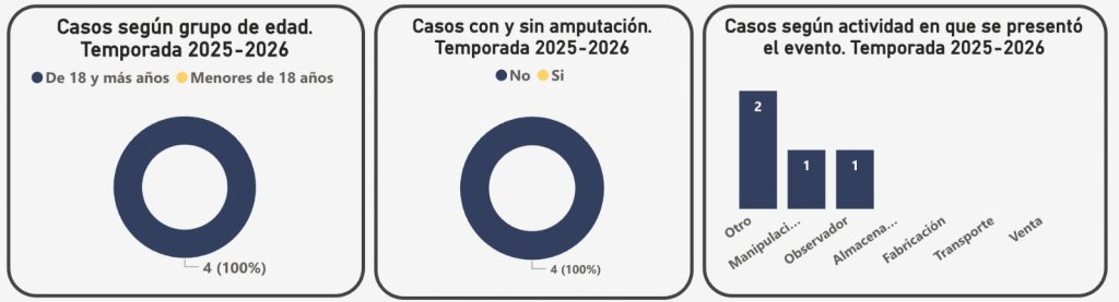 Las lesiones están asociadas principalmente a cohetes (2 casos) y papeletas (1 caso). También se registra un caso clasificado en la categoría de “otros artefactos”.