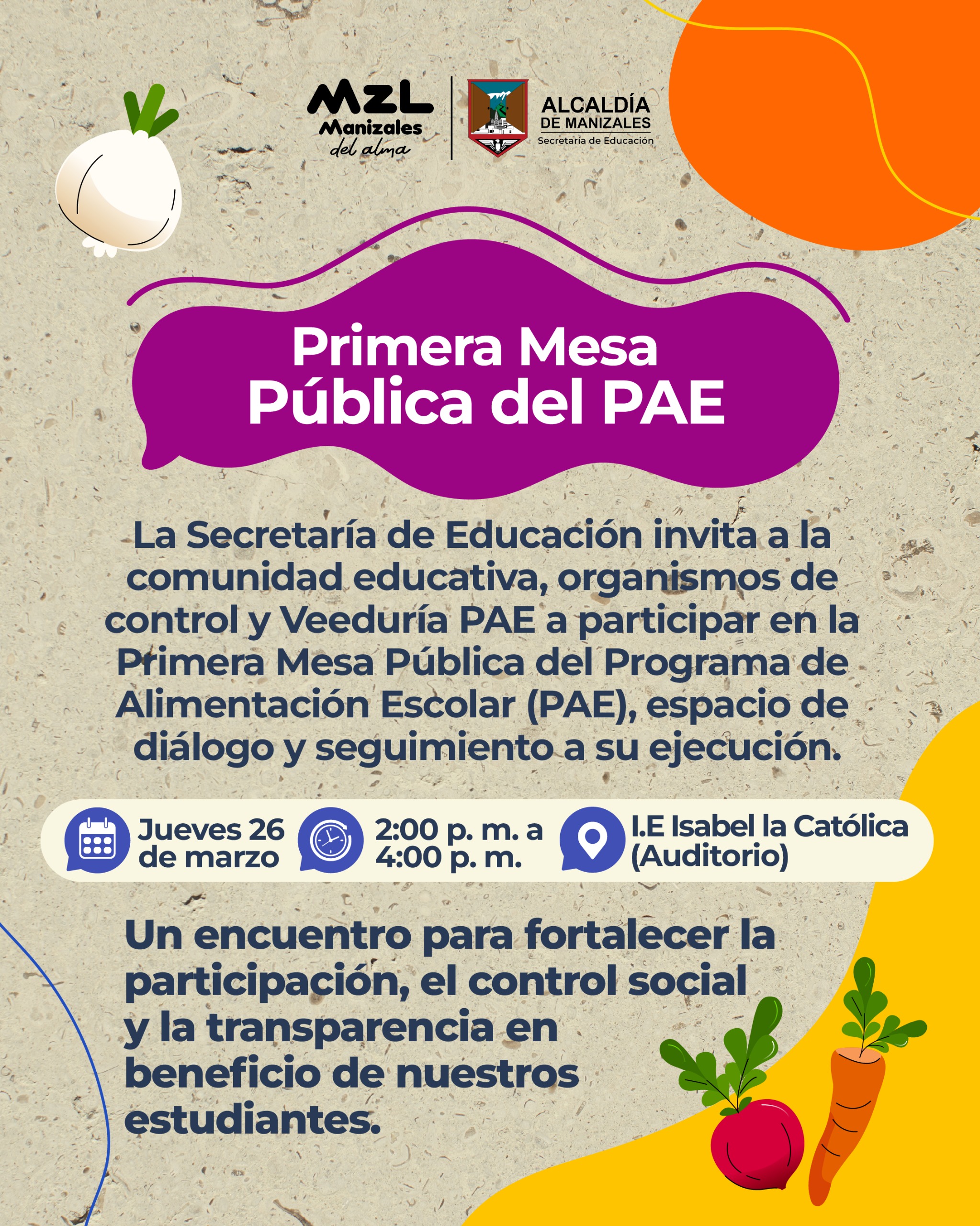 Alcaldía de Manizales Manizales realizará la Primera Mesa Pública del Programa de Alimentación Escolar (PAE) marzo 2, 2026 10:57 am