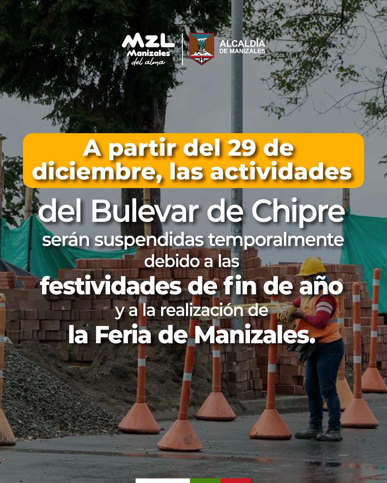 Alcaldía de Manizales Suspensión temporal de obras en el Bulevar de Chipre durante temporada navideña y Feria de Manizales diciembre 26, 2025 11:16 am